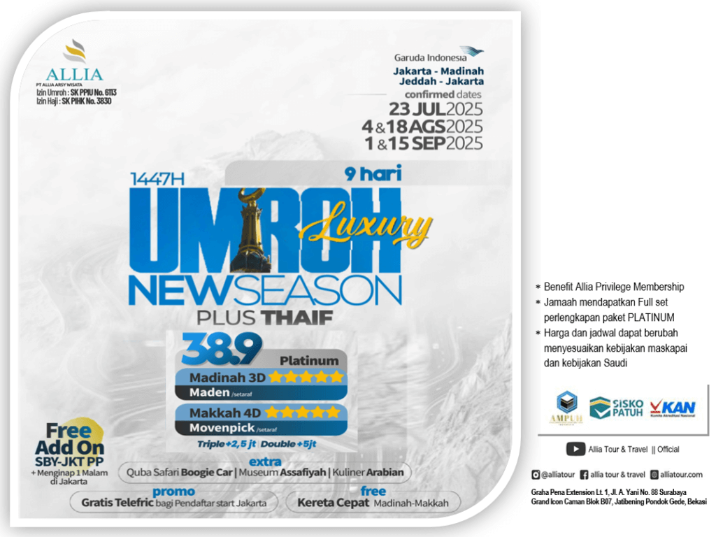 Paket PLATINUM, UMROH LUXURY Plus Thaif, 9 hari, by Garuda Indonesia (15 Sept)