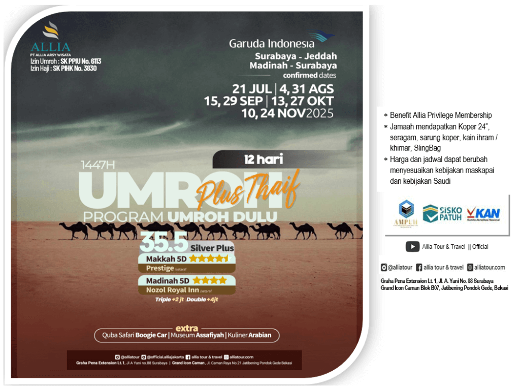 UMROH Plus Thaif, Start Srby, 12 hari, Umroh dulu, by Garuda Indonesia (28 Sept) [SILVER PLUS]