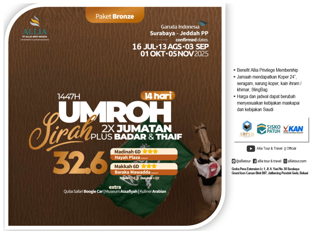 UMROH Siroh Plus Badr & Thaif, Start Srby, 14 hari, by Garuda Indonesia (01 Okt)