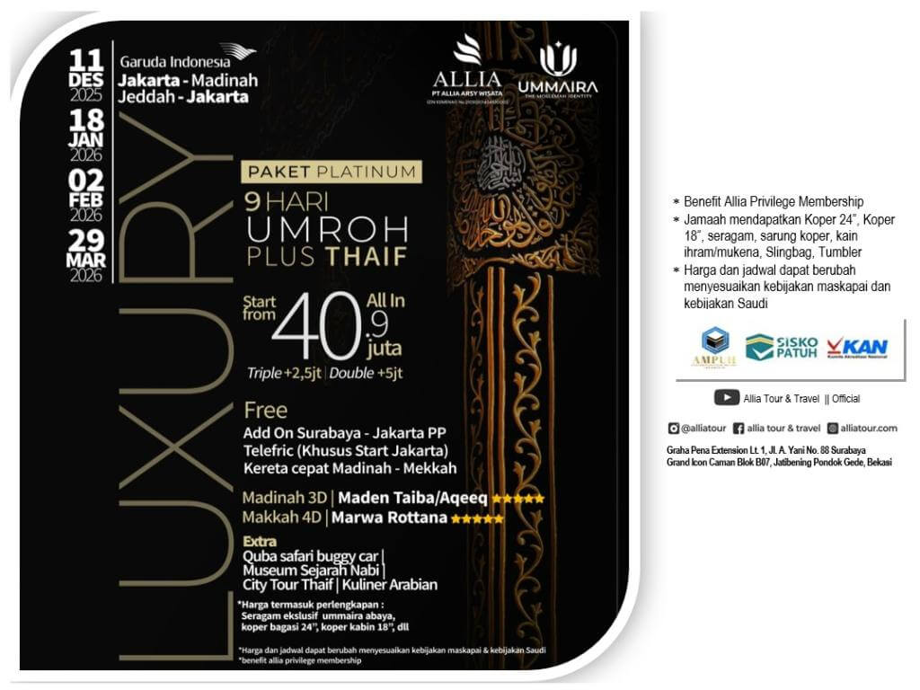 UMROH LUXURY PLATINUM, 9 HARI PLUS THAIF, START JAKARTA by Garuda (18 JAN 2026)