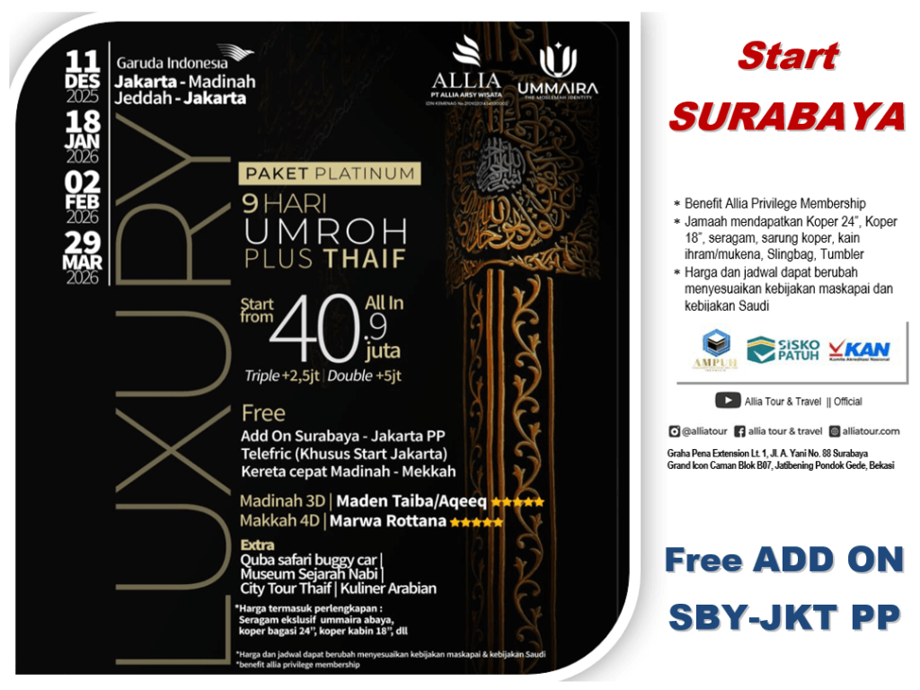 UMROH LUXURY PLATINUM, 9 HARI PLUS THAIF, by Garuda (11 Des 2025) START SURABAYA
